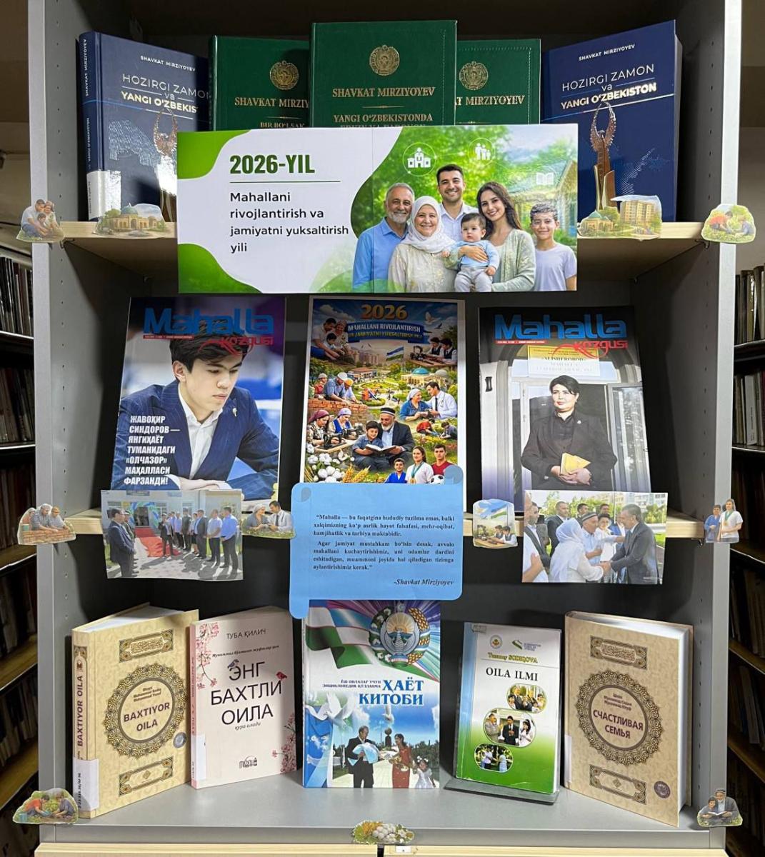 2026-yil 5-yanvar kuni Mirzo Ulug‘bek tuman axborot-kutubxona markazida mazkur mavzuga bag‘ishlangan kitob ko‘rgazmasi tashkil etildi. Ko‘rgazmada mahalla institutining jamiyat hayotidagi o‘rni, aholining faolligi, hamjihatlik va taraqqiyot g‘oyalarini yorituvchi adabiyotlar jamlandi.