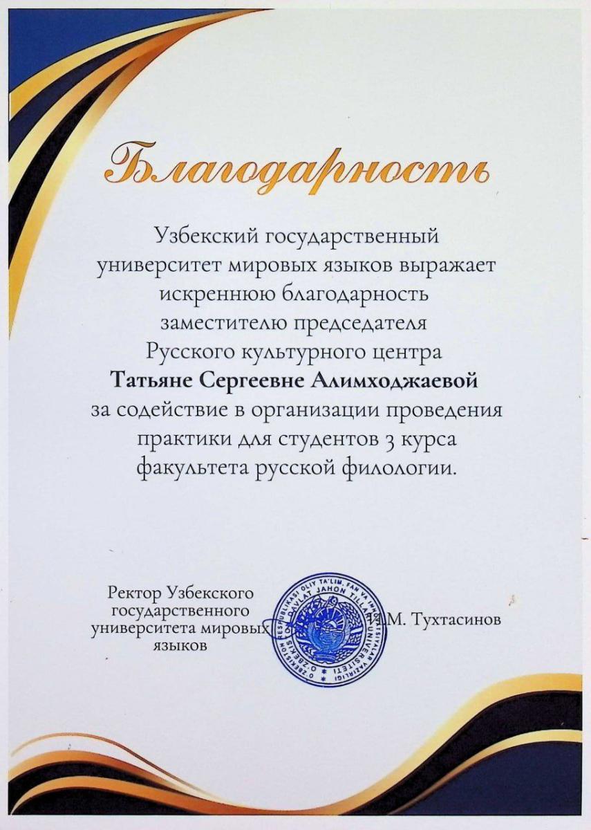 Oʻzbekiston davlat jahon tillari universiteti rektori Mirzo Ulugʻbek tuman axborot-kutubxona markaziga jahon filologiyasi sohasidagi yoshlar bilan hamkorlikdagi ishlari va universitet talabalarini kitobxonlik madaniyatini shakllantirishga jalb qilgani uchun minnatdorchilik bildirdi.